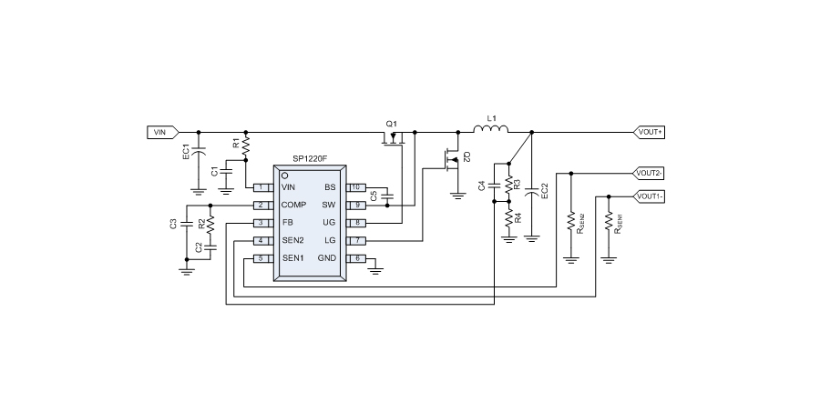 SP1220F是一款同步降壓型PWM控制器,該控制器可驅(qū)動(dòng)雙路輸出8A(4A+4A)負(fù)載電流。設(shè)計(jì)允許SP1220F在9V到40V寬輸入電壓范圍內(nèi)工作。通過將COMP/EN引腳邏輯電平拉低來實(shí)現(xiàn)外部關(guān)斷功能,并進(jìn)入待機(jī)模式。外部補(bǔ)償使反饋控制環(huán)路具有良好的線壓調(diào)整率和負(fù)載調(diào)整率,且外圍設(shè)計(jì)靈活。