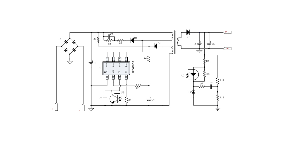 SP6649DF內置多種保護,包括逐周期限流保護(OCP),過載保護(OLP),過壓保護(VDD OVP),VDD過壓箝位,欠壓保護(UVLO),過溫保護(OTP)等,通過內部的圖騰柱驅動結構可以更好的改善系統的EMI特性和開關的軟啟動控制。