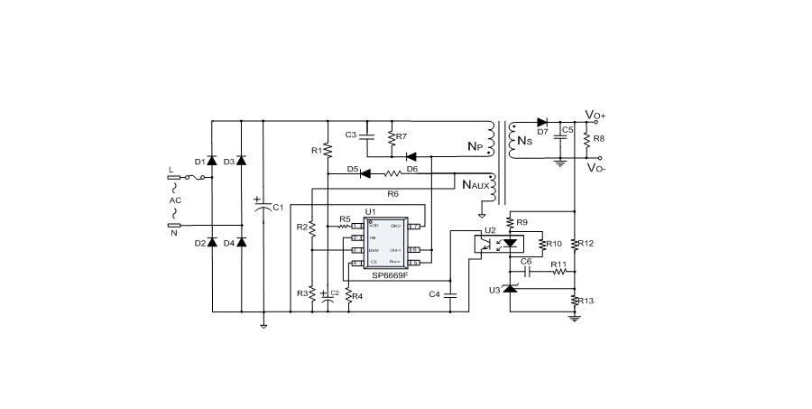 SP6669F內(nèi)置多種保護(hù),包括:輸入電壓過低保護(hù)(Brown-out),輸入電壓過高保護(hù)(Line-ovp),輸出電壓過壓保護(hù)(VO_OVP),輸出二極管短路保護(hù),逐周期過流保護(hù)(OCP),過載保護(hù)(OLP),VDD過壓保護(hù)(OVP),VDD欠壓保護(hù)(UVLO),過溫保護(hù)(OTP)等。