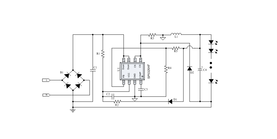SP5326AF是一款非隔離降壓型單級PFC高性能LED照明轉(zhuǎn)換電路,內(nèi)置550V高壓MOSFET,具有應(yīng)用外圍器件極少,設(shè)計簡單,功率因數(shù)高,恒流精度高等優(yōu)點。采用準諧振開啟的控制方式,提升了轉(zhuǎn)換效率。外圍應(yīng)用采用浮地架構(gòu),實現(xiàn)對電感電流進行全周期采樣,得到極高的恒流精度。