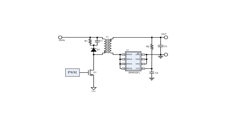 SP6552FL檢測內(nèi)置MOSFET的導通電阻(Rds-on)上的壓降,來控制MOSFET的開關(guān)。應(yīng)用外圍簡單。固定用于5V輸出的應(yīng)用方案。